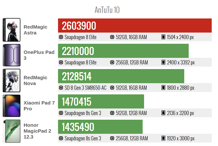 В многоядерном тестировании Geekbench 6 устройство набрало 8142 балла, в одноядерном 2654 балла. Впереди только OnePlus Pad 3. В 3DMark Wild Life Extreme (2160p) у планшета лучший результат в 6699 баллов. Также RedMagic Astra занимает первую строчку среди протестированных планшетов в AnTuTu 10. Там он набрал 2 603 900 баллов.