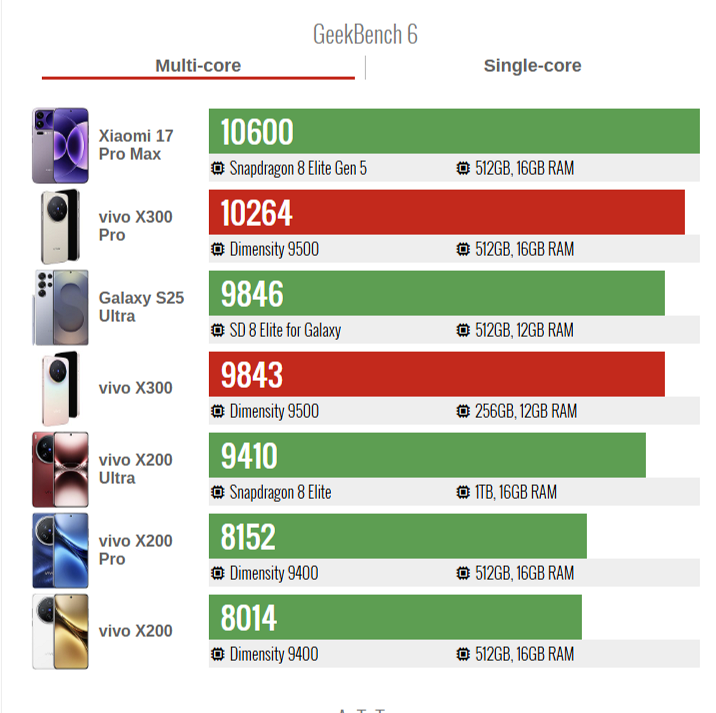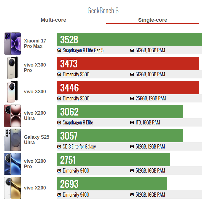 В Geekbench в многоядерном тесте vivo X300 Pro набрал 10 264 балла, а в одноядерном 3473. Это меньше, чем у Xiaomi 17 Pro Max, у которого 10 600 и 3528 баллов соответственно. У vivo X300, к слову, 9843 и 3446 баллов.