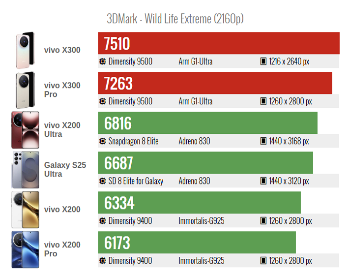 Что касается 3DMark Wild Life Extreme (2160p), то тут vivo X300 показал лучший результат в 7510 баллов, а vivo X300 Pro набрал 7263 балла.