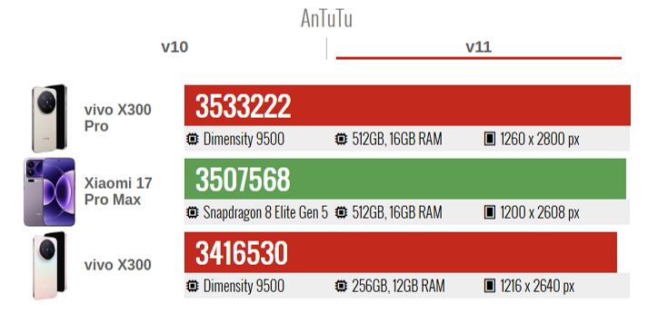 В AnTuTu v11 у флагмана vivo X300 Pro рекордные 3 533 222 балла. И это даже больше, чем у Xiaomi 17 Pro Max на базе Snapdragon 8 Elite Gen 5 (3 507 568 баллов). Таким образом, свежий Dimensity 9500 может на равных состязаться с актуальным флагманским процессором Qualcomm и даже обходить его. К слову, у компактного vivo X300 результат в 3 416 530 баллов.