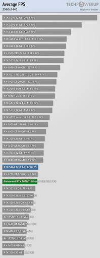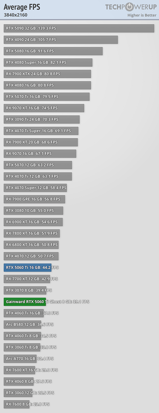 В 1440p у GeForce RTX 5060 Ti c 16 ГБ видеопамяти есть небольшое преимущество. Но речь идет лишь о несколько процентах. А вот 4K разница огромная. GeForce RTX 5060 Ti c 8 ГБ VRAM отстает от версии с удвоенным объемом видеопамяти до 30%.