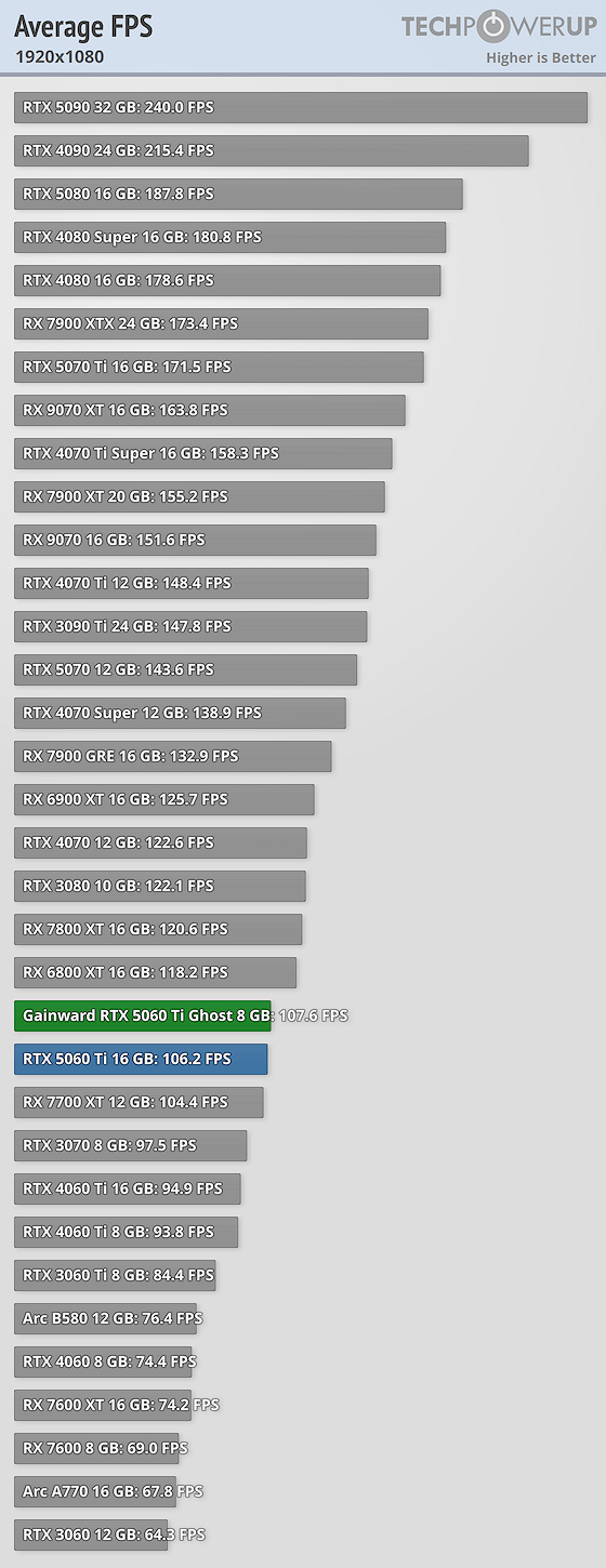 В разрешении 1080p разница между GeForce RTX 5060 Ti c 8 и 16 ГБ видеопамяти практически отсутствует. В большинстве игр частота кадров идентичная. Причем это касается как среднего показателя fps, так и значения 1 % Low.