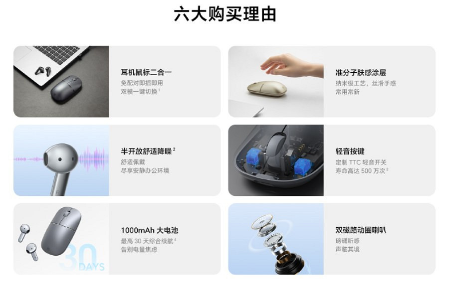 HONOR Select Yuewo Wireless Ear Mouse Pro представляет собой мышку, в корпусе которой размещены беспроводные наушники. Мышка также выступает в качестве зарядного кейса. Таким образом, пока пользователь работает за компьютером, наушники заряжаются. Отмечено, что несмотря на невысокий ценник наушники поддерживают функцию снижения уровня шума.