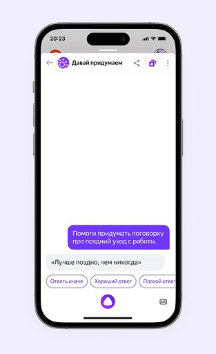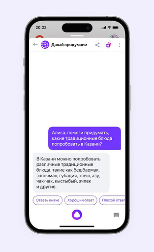 Алиса с нейросетью уже доступна в основном приложении Яндекса, в Браузере, колонках Станциях и умных телевизорах с Алисой. Чтобы запустить чат, надо сказать «Алиса, давай придумаем!»