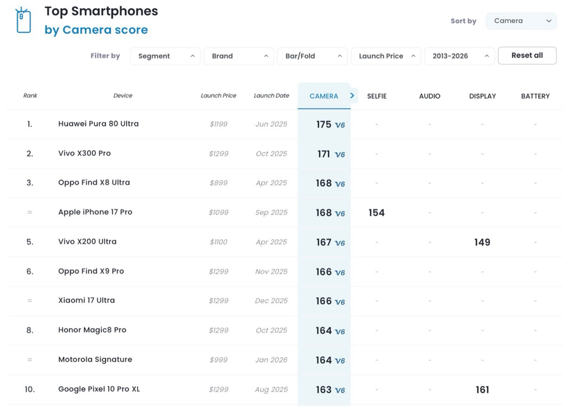 Устройство набрало там 166 баллов. И это намного меньше, чем у лидера в лице HUAWEI Pura 70 Ultra, у которого 175 баллов. Что касается iPhone 17 Pro, то у этой модели четвертая строчка в топе и 168 баллов. Также Xiaomi 17 Ultra уступил vivo X300 Pro (171 балл), OPPO Find X8 Ultra (168 баллов), vivo X200 Ultra (167 баллов) и OPPO Find X9 Pro (166 баллов).