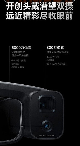 Устройство получило 0,23-дюймовый microLED-дисплей от Sony с плотностью пикселей 328 ppi. Тыльная камера двойная, с датчиками на 50 и 8 Мп (основной модуль и ширик). Оптический зум пятикратный, цифровой — 15-кратный. Заявлена система оптической стабилизации.