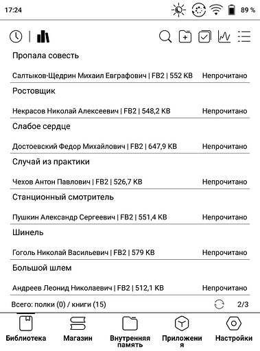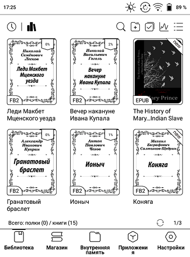 Библиотека. Здесь собраны все книги. Их можно выводить миниатюрами обложек или списком, искать по названию или по фильтрам.