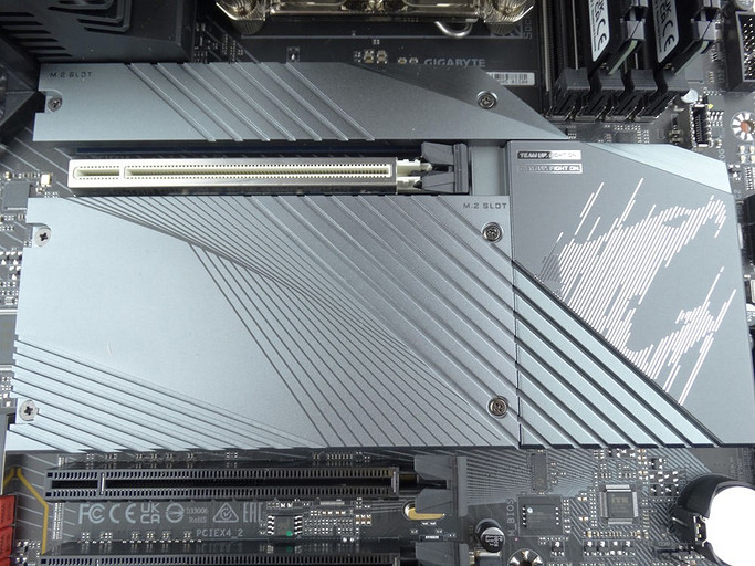 Для тестирования Kingston KC3000 мы использовали системную плату Gigabyte Z690 AORUS PRO с отдельным отсеком для твердотельных накопителей, снабженных термопрокладкой снизу и съемной радиаторной панелью сверху. Сняв панель, устанавливаем SSD в слот, прижимаем его к термопрокладке с помощью винта и ставим на место радиатор материнской платы.