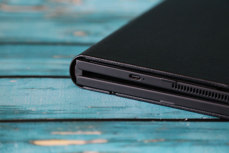 Lenovo ThinkPad X1 Fold в раскрытом положении напоминает большой 13,3-дюймовый планшет. Разве что с непривычно большими рамками и с без хорошего олеофобного покрытия. С обратной части — приятный кожаный чехол.