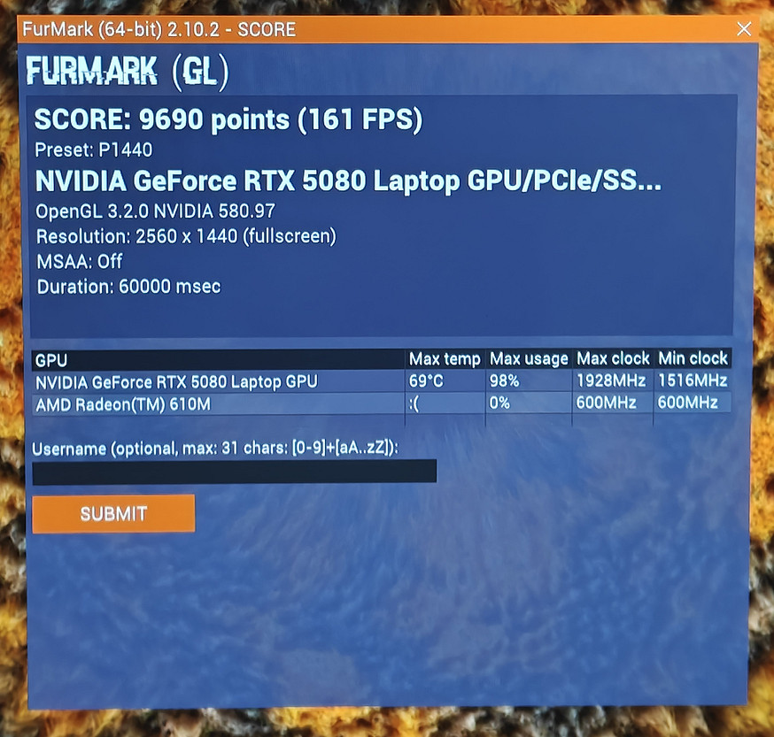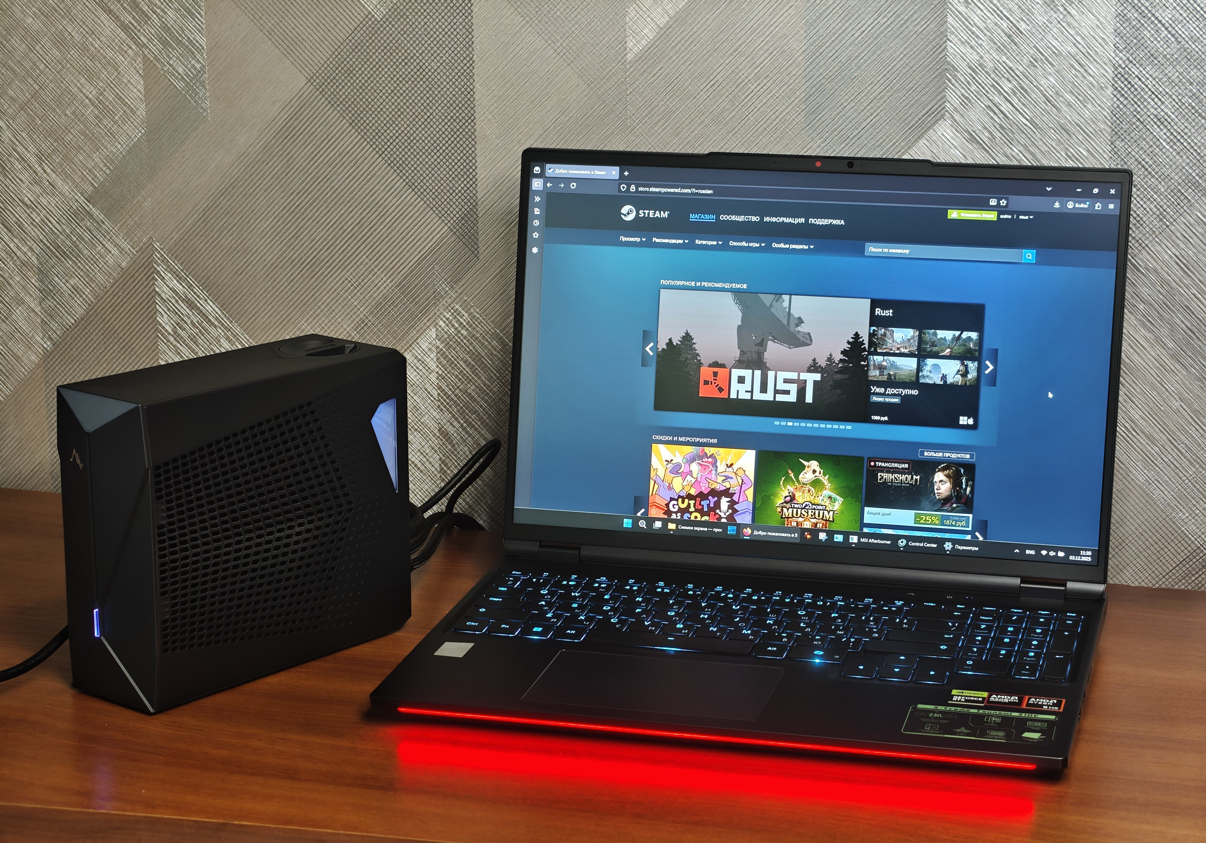 Работает наш «красный» процессор, как и полагается по-настоящему игровому устройству, в паре с «зелёной» видеокартой NVIDIA GeForce RTX 5080 для ноутбуков. Это топовое решение с 16 ГБ памяти GDDR7, поддержкой DLSS 4, трассировки путей и лучей, большим запасом мощности. Внешний водоблок помогает держать температуру GPU на уровне, недоступном обычным ноутбукам. Разница ощущается буквально с первых тестов: частоты выше, троттлинга почти нет, FPS максимально стабилен.