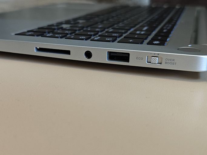 Что здесь точно стоит отметить, так это тачпад. Во-первых, он огромный даже для такого ноутбука. Во-вторых, палец отлично скользит по поверхности, а панель адекватно реагирует на нажатия. С интерфейсами у полноразмерных ноутбуков редко бывают проблемы. Здесь тоже есть практически любые разъемы для подключения. На левом торце — два USB-С, один из которых используется и для зарядки, USB-A и HDMI. Справа — еще один USB-А, аудиоджек 3,5 мм и слот для карт памяти.
