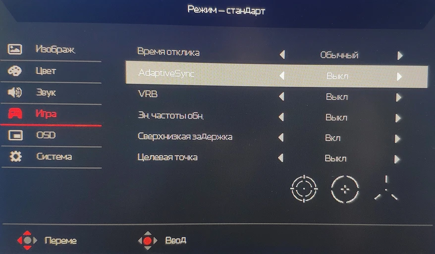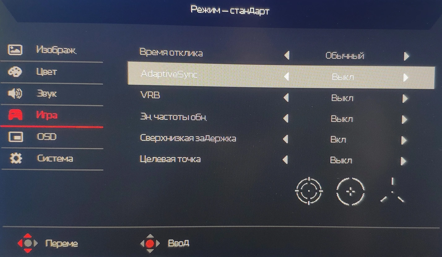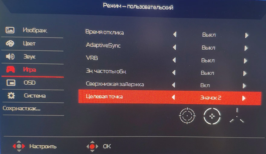 В игровых параметрах можно выбрать вид дополнительного прицела (“Целевая точка”), активировать адаптивную синхронизацию и отображение частоты обновления кадров, а также настроить время отклика. Еще одна полезная функция - Dark Boost ("Усиление черного") - позволяет увеличить контрастность изображения, чтобы было легче рассмотреть объекты в тени и темных сценах.