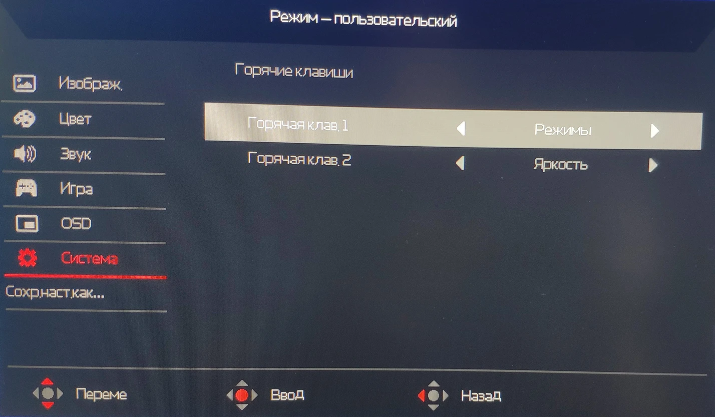 Кнопки для управления меню находятся сбоку, на торце. Чтобы перемещаться между разделами настроек можно использовать красный джойстик. В целом, это довольно удобно, но вряд ли вы будете часто что-то настраивать — достаточно задать нужные параметры один раз, а потом просто менять режимы.