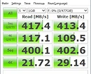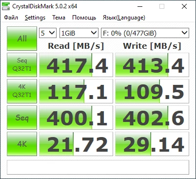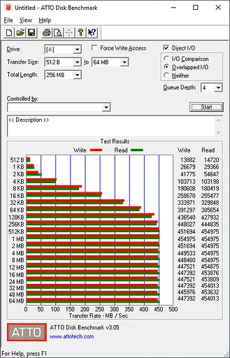 Синтетические тесты на производительность осуществлялись с использованием популярных бенчмарков. Так, Crystal DiskMark продемонстрировал скорость чтения данных более 417 МБ/с, а на запись чуть ниже — 413 МБ/с. В другом бенчмарке ATTO Disk Benchmark в аналогичных измерениях результаты были существенно выше: 454 МБ/с — на чтение и 447 МБ/с — на запись. Впечатляет! Ведь точно такие же скорости обеспечивают современные SSD, подключенные в ПК по SATA-интерфейсу.