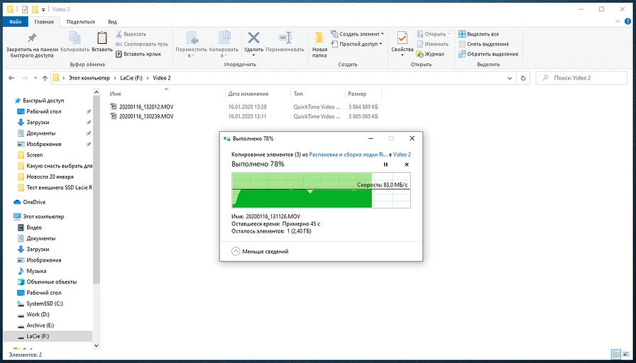 Как видно из скриншотов, скорость копирования с SSD составляет около 300 МБ/с, что существенно выше такой же операции при передаче данных с внутреннего HDD — около 83 МБ/с.