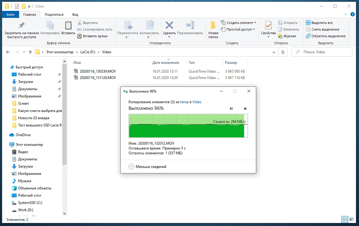 Rugged SSD может подключаться к компьютеру через два различных интерфейса, что обуславливает скорость передаваемых данных. В нашем тестовом компьютере мы использовали кабель USB Type-C со стандартным штекером USB 3.0. Стоит учесть и еще один момент, а именно — с какого диска в компьютере будет выполняться копирование на этот внешний SSD. Для чистоты эксперимента мы провели два теста: один с передачей данных с типового HDD (скорость шпинделя 5200), и второй — с внутреннего SSD. Ниже мы демонстрируем скорость копирования видеофайлов с разрешением 2,7K и объемом по 3,9 ГБ каждый.