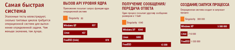 Таким образом, Windows, Linux и прочие системы могли бы уже сегодня без дополнительной оптимизации работать на 30% быстрее. Для этого необходимо просто отключить аппаратную защиту и пренебречь стабильностью. Singularity же может отказаться от защиты и остаться после этого стабильной системой. Этот фактор приводит к впечатляющим показателям производительности (см. тесты слева). Так что задержки, обусловленные использованием безопасных языков программирования, компенсируются с лихвой.