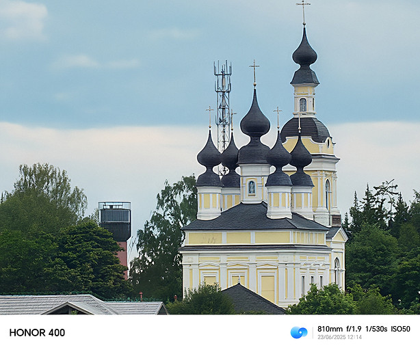 Можно снимать и в более значительным приближением. У HONOR 400 есть функция «AI-суперзум», которая как раз заточена на улучшение качества снимков при больших увеличениях (от 15х до максимально возможного 30х). Она активируется отдельной кнопкой со значком AI в левой нижней части интерфейса, я уже знаком с ней по HONOR Magic 7 Pro. Если коротко — с архитектурой и пейзажами работает отлично, хотя может дорисовать элементы, которых нет на самом деле. Можно сравнить, как выглядят снимки с «AI-суперзум» и без него: разница очевидна.