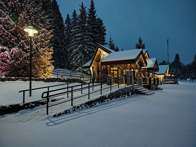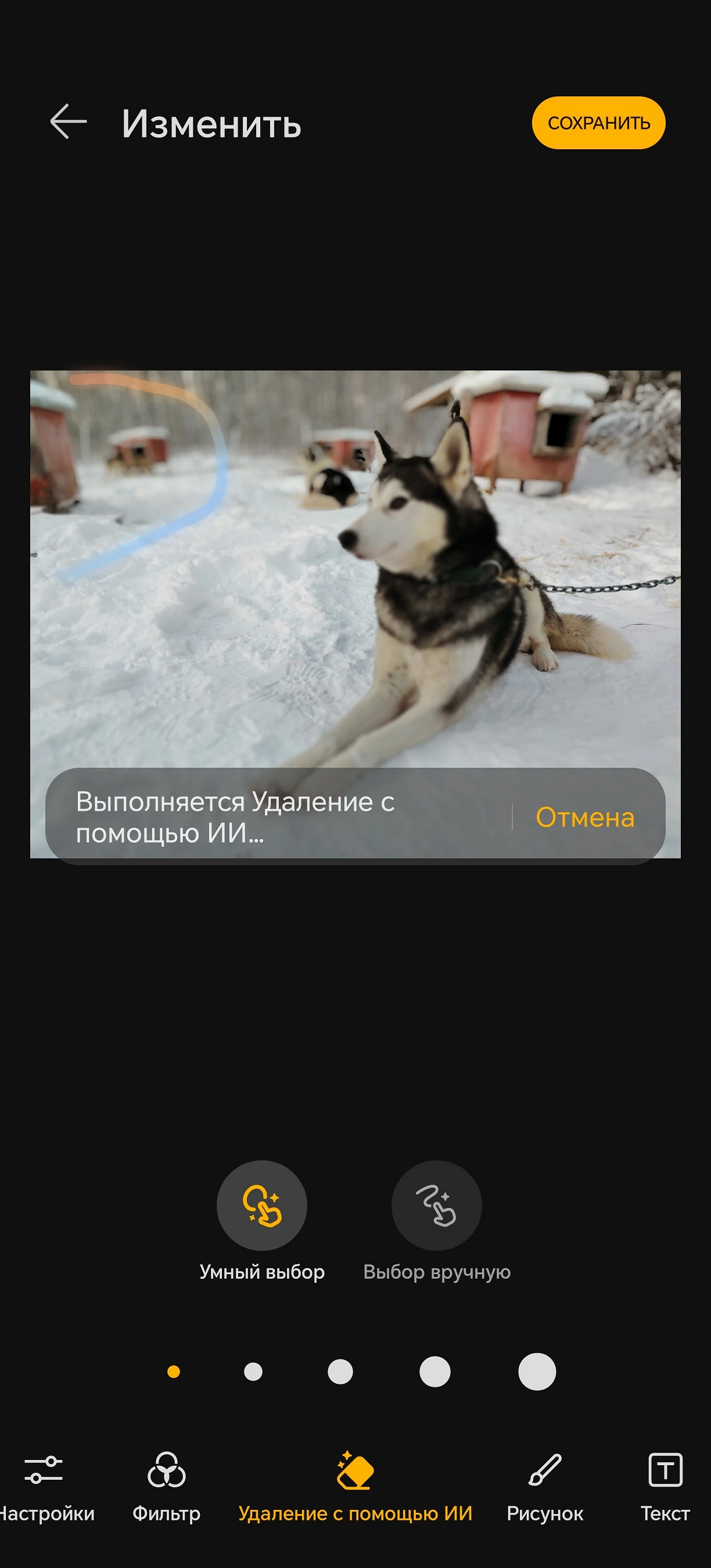 Встроенные ИИ-функции теперь есть не только во флагманских моделях смартфонов. У HONOR X9с отлично работает интеллектуальное удаление объектов на фото — этот режим доступен в редакторе (кнопка «Изменить» при просмотре фотографии, затем «Удаление с помощью ИИ». На примере ниже я обвел пару «лишних» будок в левой верхней части фотографии, и нейросеть быстро заменила их фоном. Обычно теряется фактура (вместо снега получается белая каша), но в глаза не бросается.