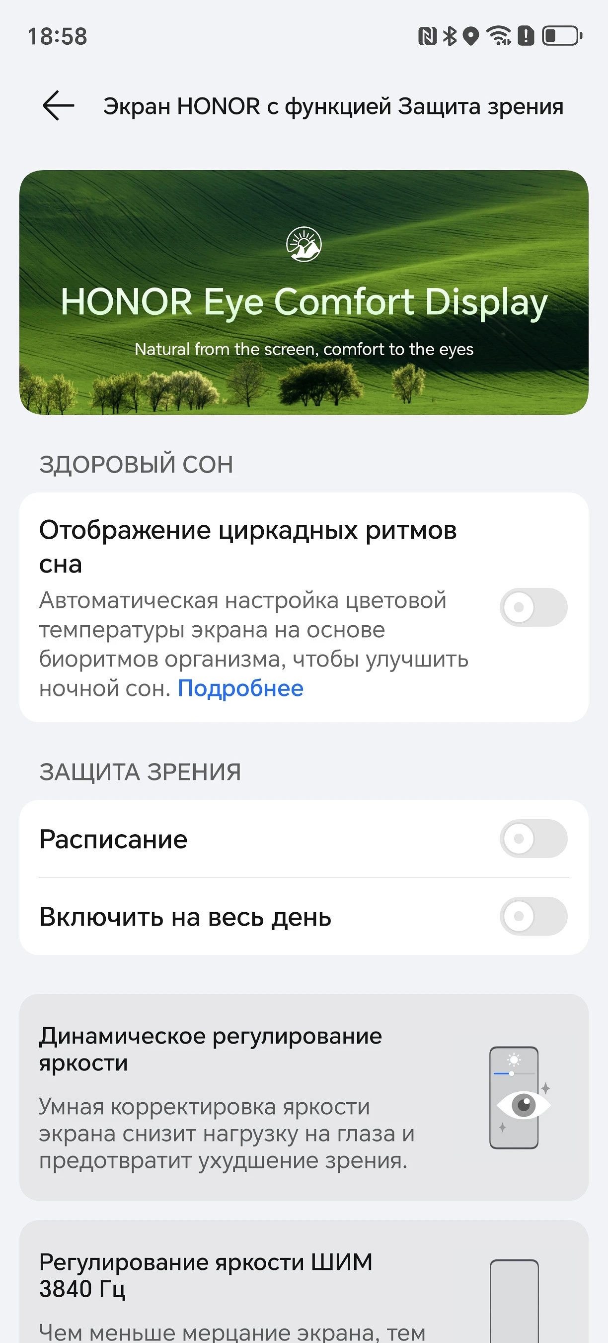 Особых изменений в возможностях настройки дисплея нет. В распоряжении пользователя по-прежнему широкий выбор настроек цветовой палитры, вариантов защиты зрения. Например, можно установить автоматическую настройку цветов, и экран будет менять цветовую температуру в зависимости от времени суток (циркадных ритмов). Любителям почитать по ночам подойдет режим электронной книги.