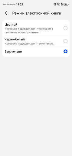 Режимы защиты зрения на месте, в том числе режим электронной книги (причем не только черно-белый, но и цветной).
