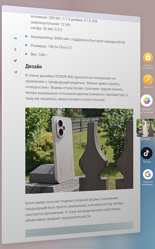 С Magic Portal очень удобно делиться текстом или фотографиями. Например, фото на странице можно просто зажать пальцем, дождаться появления меню справа (оно настраиваемое) и кинуть в нужное приложение. Если не хочется выделять кусок текста, достаточно обвести его костяшкой пальца — выделится сам.