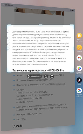 Не так давно операционка стала обрастать и нейросетевыми функциями. Например, с помощью приложения HONOR Заметки можно отформатировать текст, получить его короткий пересказ, расшифровать аудиозапись. Причем записывать аудио можно прямо из заметок.