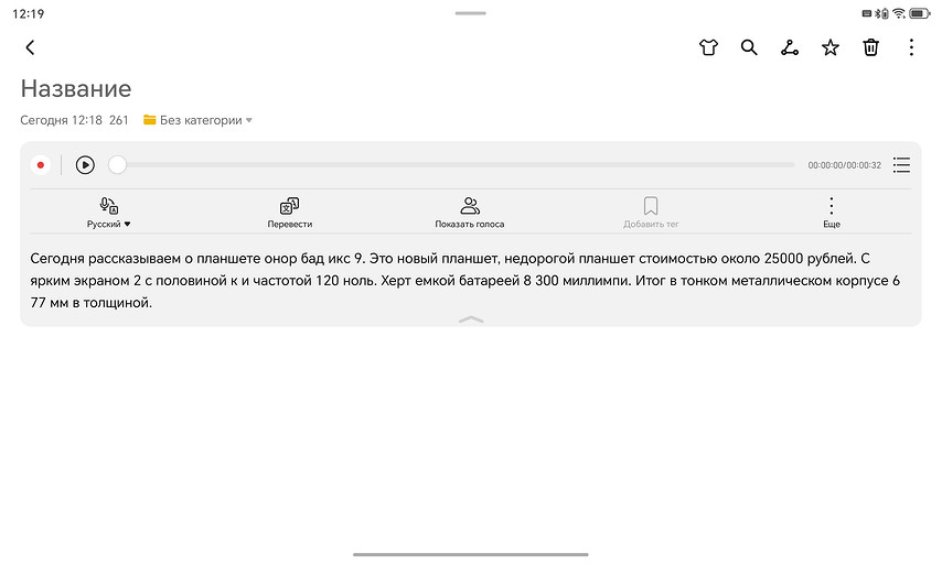 Отдельно стоит отметить нейросетевые функции, которые есть уже даже в недорогих устройствах. Например, HONOR Заметки умеют переводить рукописные формулы в печатный вид. А еще проводить расшифровку аудиозаписей, причем на разных языках. Качество расшифровки не идеальное, но если не мучить нейронку «миллиамперчасами» и прочей спецификой, серьезных косяков возникнуть не должно.