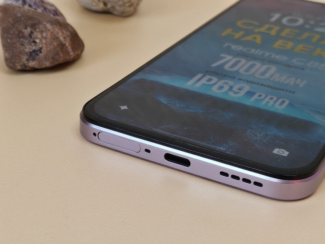 По компоновке здесь все стандартно: слот для карт и разъем USB-C снизу, кнопка включения с интегрированным датчиком отпечатка пальца и клавиши регулировки громкости — справа. Интересно, что уже даже в бюджетных смартфонах все реже встречаются 3,5-мм аудиоджеки: например, на С85 таких нет.