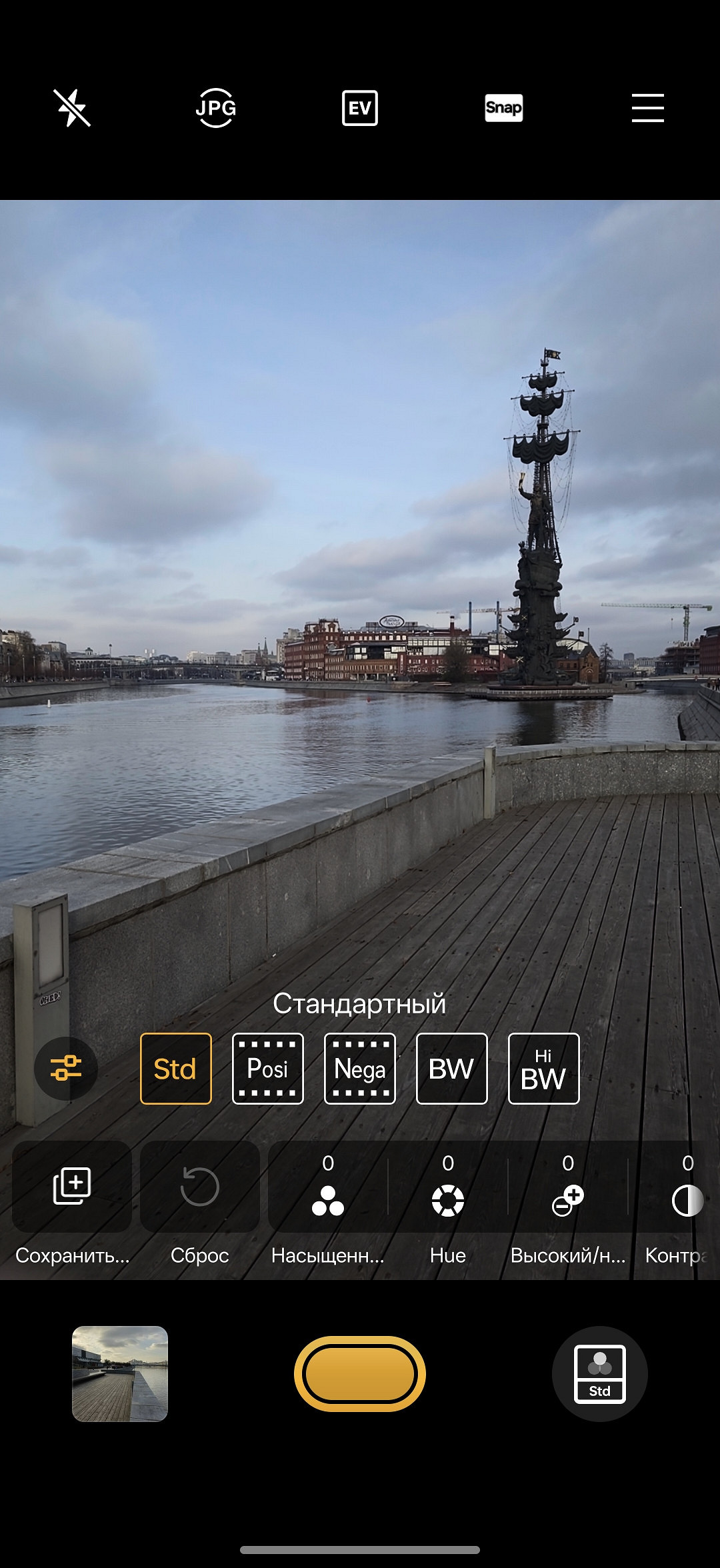 Главной фишкой нового режима я бы назвал настраиваемые пресеты для съемки. Их здесь пять: Стандартный (Standard), Позитивная пленка (Positive Film), Негативная пленка (Negative Film), Однотонный (Monotone) и Высококонтрастный черно-белый (High-Contrast B&W).