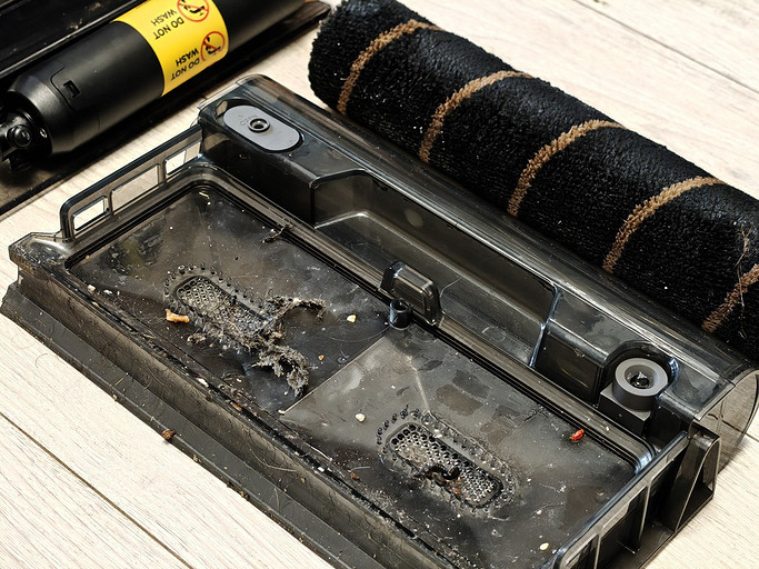 Еще одна насадка, которую тоже можно назвать основной (не зря же покупатель выбрал AquaCycle) — для влажной уборки пола. Устроена она так. В задней части находится резервуар для чистой воды. Эта вода поступает на валик, а затем мощный поток воздуха отводит уже отработавшую жидкость в другую емкость (она расположена сразу за валиком). У этой емкости есть сетчатый фильтр, который задерживает крупные частички мусора и волосы. А грязная вода без проблем проникает внутрь.