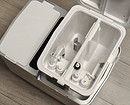 Емкость с баками имеет удобную ручку, можно потянуть за нее вверх и снять со станции. Оба бака выполнены одной деталью, отдельно не снимаются. Такое решение сначала показалось нам не очень практичным, но потом мы поменяли свое мнение. Действительно, когда в одном из баков заканчивается чистая вода, второй уже почти полон, и нужно его опорожнить. Поэтому выливаем грязную, промываем емкость, а потом наливаем свежую. За счет небольшой высоты, баки легко умещаются в раковину, и набрать воду проблем не составляет.