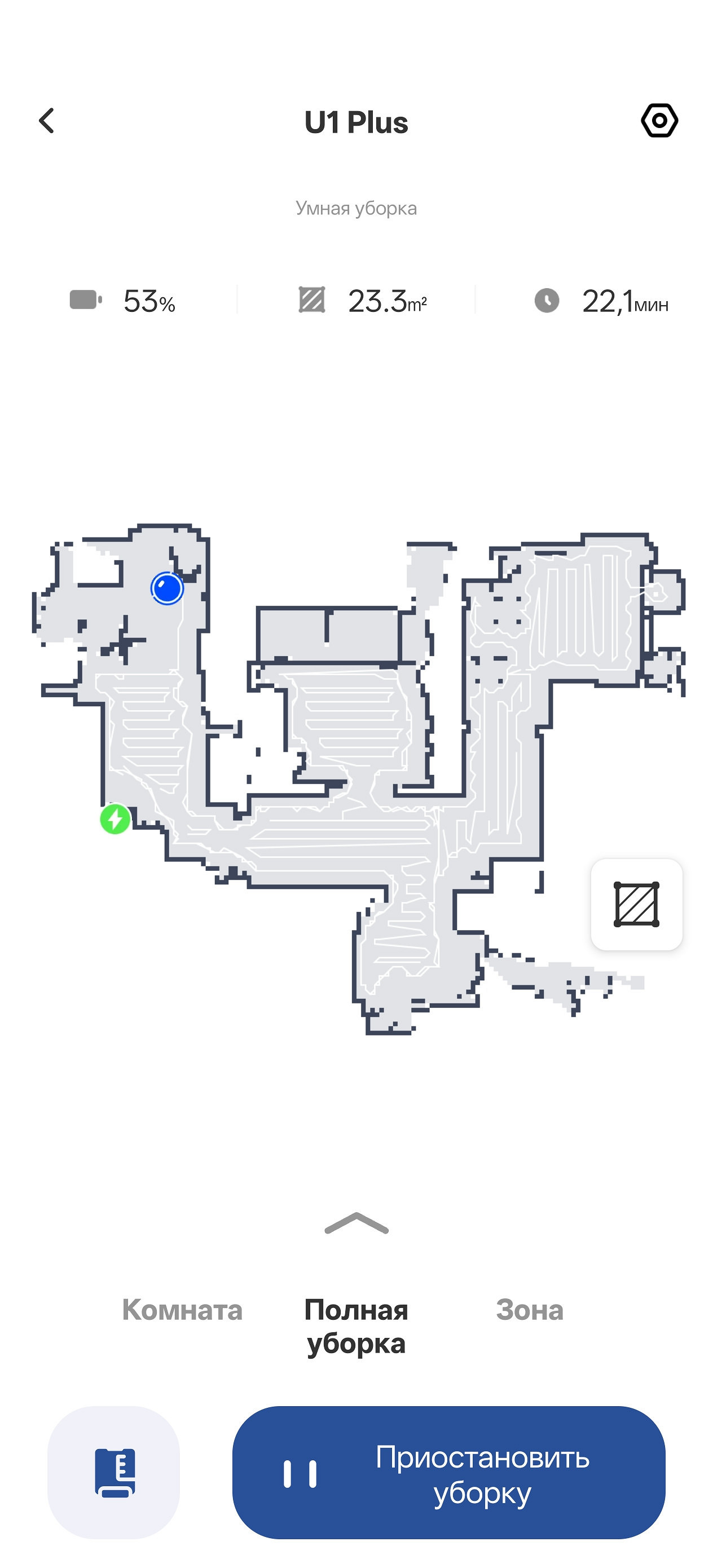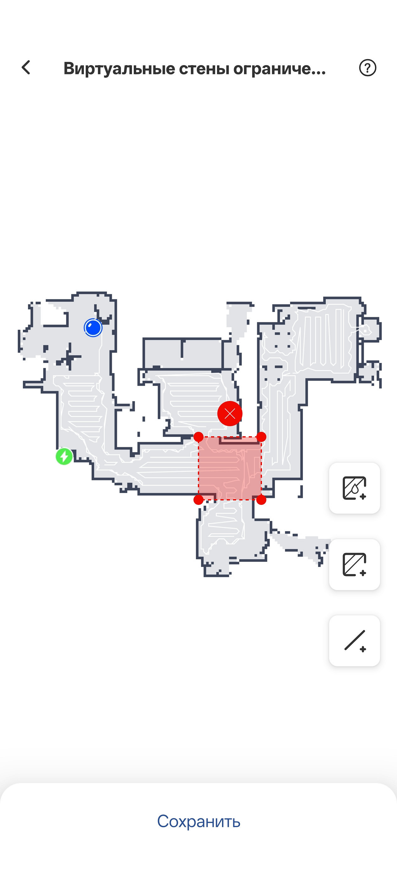 Традиционно для начала работы роботу нужно составить карту. Для этого он довольно шустро объезжает все комнаты. После составления карты робот делит всю площадь на комнаты на свое усмотрение. В нашем случае разделение прошло неидеально, но есть возможность выполнить корректировки вручную. Также можно установить запретные зоны как для робота, так и конкретно для влажной уборки (например, обозначить ими ковры).