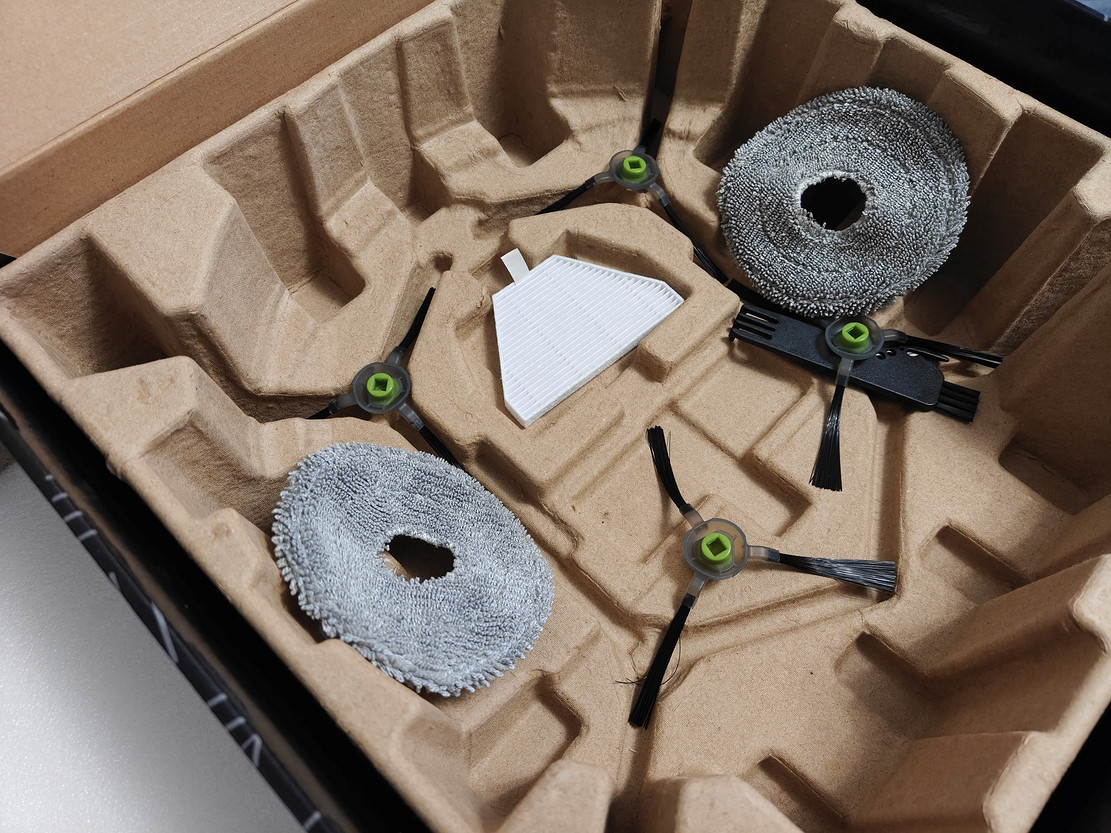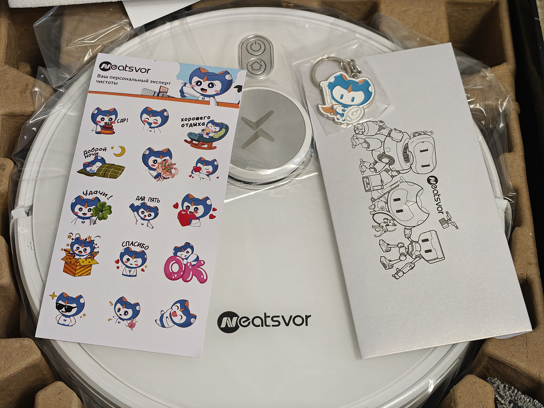 Внутри коробки Neatsvor U1 Plus помимо самого пылесоса и станции мы нашли комплект запасных расходников — две боковые щетки, мешок для пыли и фильтр тонкой очистки. Производитель положил даже брелочек с фирменной символикой и комплект наклеек на русском языке. Мелочь, а приятно.
