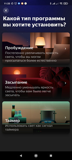 Там же, в приложении, можно настроить такие сценарии, как «Пробуждение» или «Засыпание». В первом случае девайс будет постепенно увеличивать яркость, иммитируя восход солнца, в последнем — убавлять.