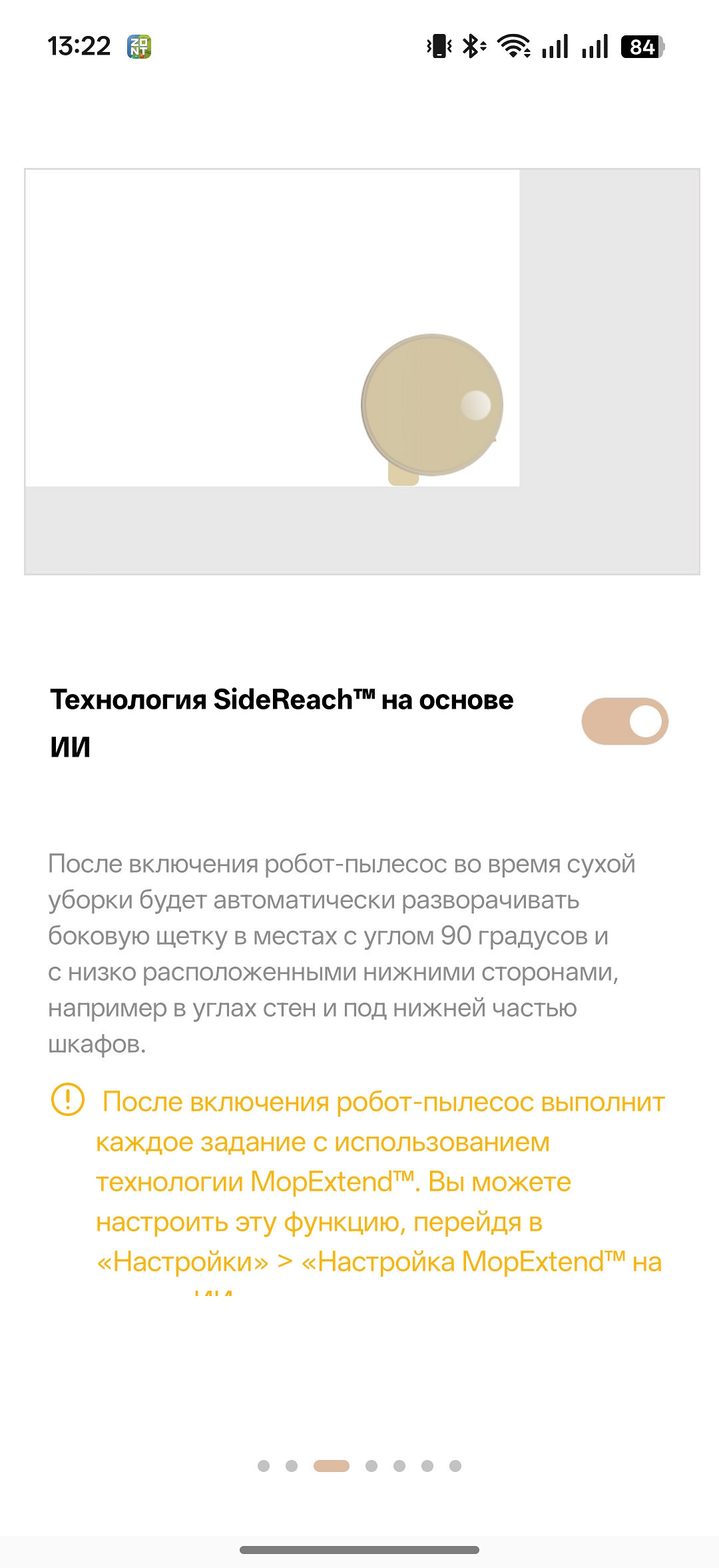 Как ролик, так и боковая щетка могут выдвигаться в сторону для уборки в непосредственной близости от плинтуса (технология MaxiReach). Робот сам понимает, когда нужно задействовать такие возможности. Лучше всего это иллюстрирует фирменная картинка.