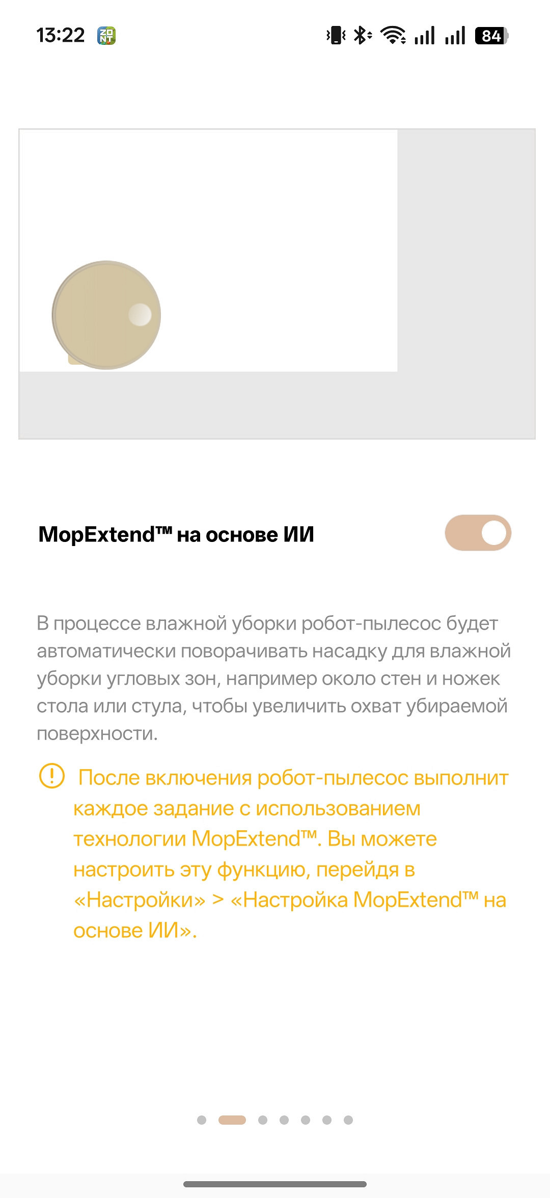 Полезная опция — динамическая уборка зоны с препятствиями. Если в процессе работы робот наткнулся на вас и объехал, он запомнит это место и потом вернутся его протереть. Как выяснилось, функция отлично решает проблему со стульями и офисными креслами. Можно откатить кресло к стене, а потом поставить на место (которое робот уже подмел). Предварительно нужно включить «Индивидуальное обнаружение препятствий».