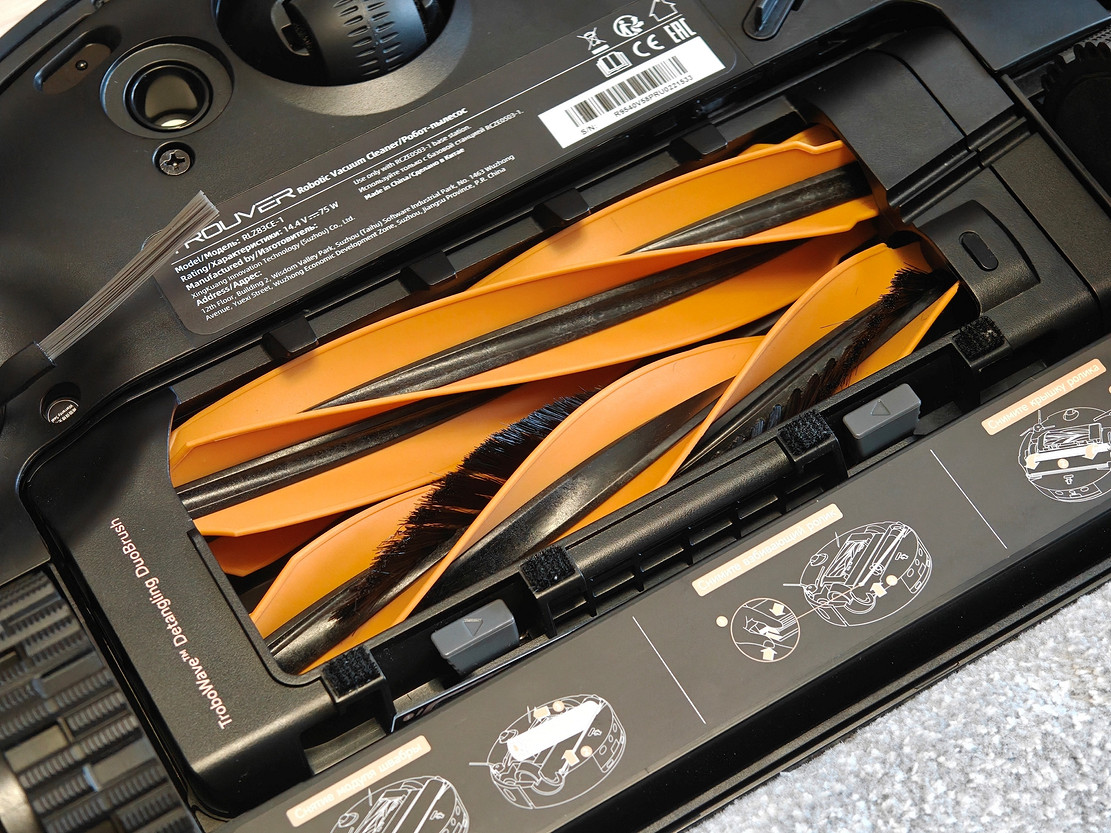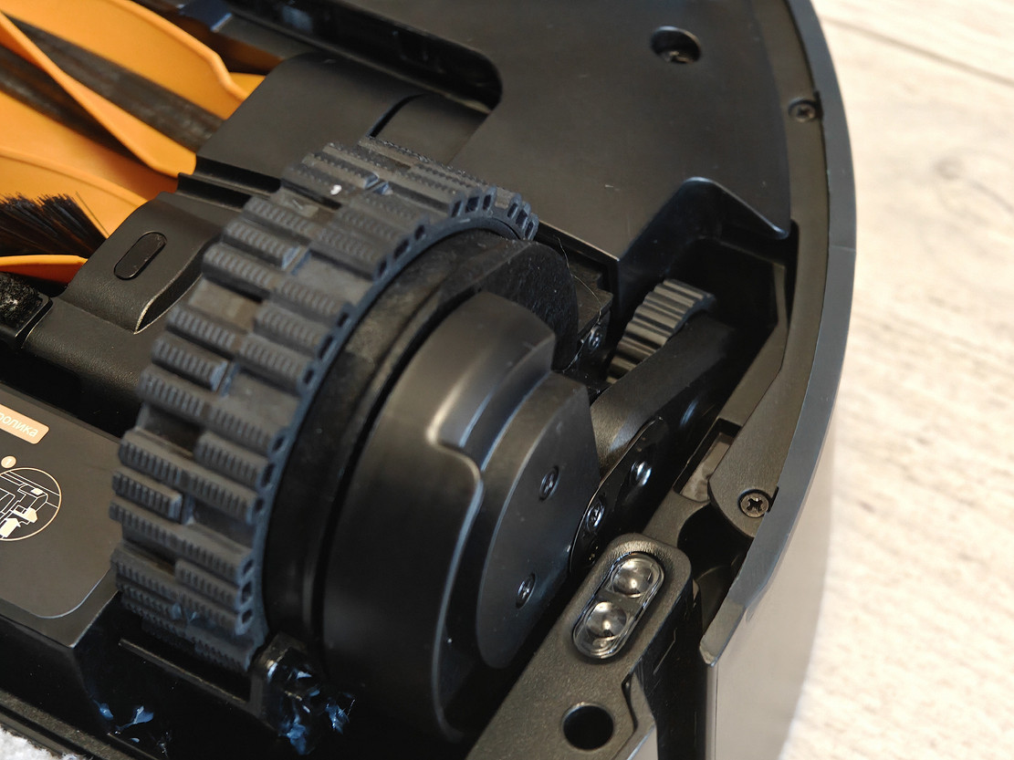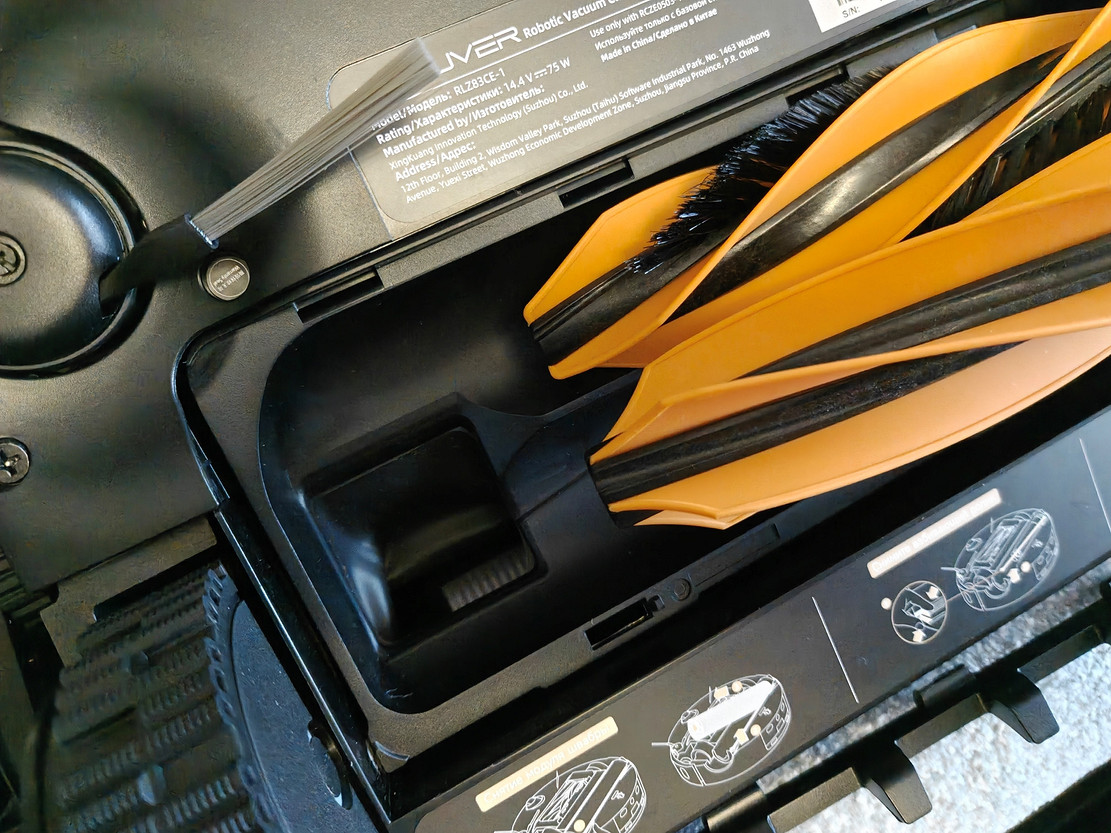 Что касается самого робота, здесь интересного больше. Ролик теперь стал обычным, круглым. Возможно, это более простое решения с точки зрения механики. Когда робот распознает ковер, ролик автоматически поднимается вверх на 14 мм, а выдвижной щиток закрывает его, чтобы ворс ковра не намокал.