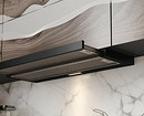 Это модели, которые монтируют в навесной шкаф, но их нижняя декоративная панель остается видимой. Она формирует аккуратный козырек над варочной поверхностью. Управление располагается на фронтальной панели: кнопки, слайдеры или сенсор.