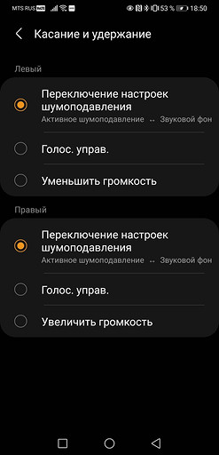 В приложении можно настроить функции сенсорных клавиш, чтобы регулировать с их помощью громкость, активировать шумодав или голосовое управление, ставить треки на паузу и переключать их. Кстати, интенсивность шумоподавления тоже регулируется в приложении. А если, наоборот, нужно усилить окружающие звуки (например, во время разговора с коллегами) — в программе можно выбрать функцию «Звуковой фон».