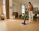 Моющий пылесос сразу с двумя валиками для еще более качественной уборки. Основную грязь принимает на себя валик, установленный в передней части, а тот, что находится сзади, уже финально начисто промывает пол. Насадка кажется массивной, но у нее есть большой плюс: пылесос можно вертикально «припарковать» в любом месте, и он будет надежно стоять. Кроме того, пара валиков позволила реализовать режим деликатной уборки: вода подается только на передний, а второй протирает поверхность насухо. Получается, следов от влажной уборки практически не остается. Такой режим предназначен для покрытий из натурального дерева, ламината и прочих чувствительных к влажности поверхностей.