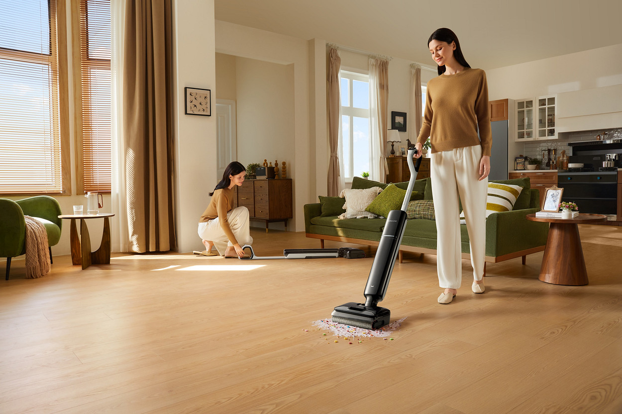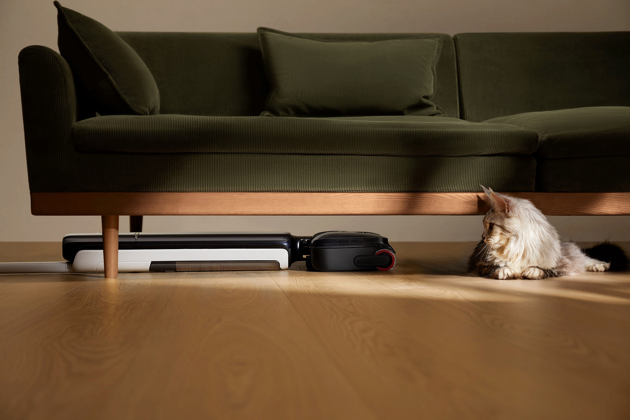 Главная проблема моющих пылесосов в том, что они громоздкие (по сравнению с обычными вертикальными). Но в этом году у Dreame появилась интересная новинка с тонким корпусом — G12. Большой плюс этого пылесоса в том, что он может раскладываться горизонтально и убираться в том числе под мебелью на ножках. Здесь как раз и ощущаются преимущества тонкого корпуса: он меньше 10 см высотой в горизонтальном положении, так что легко пролезает практически в любое пространство.