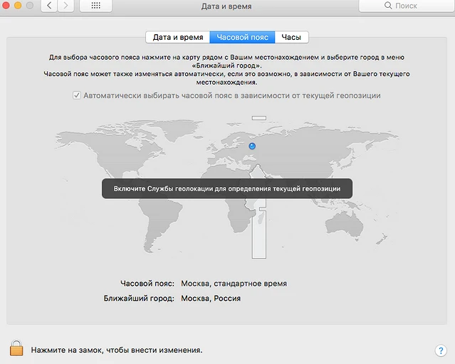 В дополнение рекомендуем установить часовой пояс в соответствии с регионом проживания. Снова нажмите на значок яблока в верхнем левом углу экрана, затем на пункт «Системные настройки», но теперь перейдите во вкладку «Часовой пояс». Напротив пункта «Автоматически выбирать часовой пояс в зависимости от текущей геопозиции» установите флажок. Если ваш регион определяется некорректно, снимите флажок и выберите регион на карте вручную.