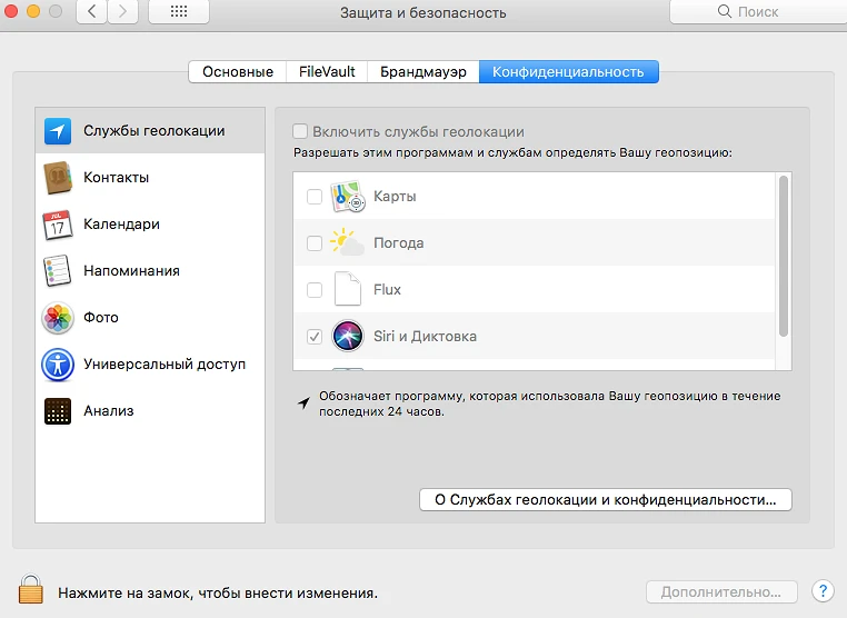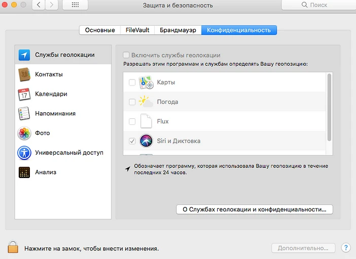 Может случиться так, что Mac не сможет определить ваше текущее местоположение. Это происходит потому, что определение по геопозиции запрещено. Для исправления ситуации сделайте следующее: Снова нажмите на значок яблока в верхнем левом углу экрана, выберите «Системные настройки» и откройте вкладку «Защита и безопасность». На панели «Конфиденциальность» выберите «Включить службы геолокации».
