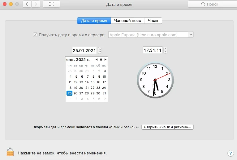 Если вы заметили, что на вашем Mac время и дата сбиты, нажмите на значок яблока в верхнем левом углу экрана, затем на пункт «Системные настройки», после нажмите «Дата и время». В появившемся окне, в левом нижнем углу кликните на пиктограмму замка, чтобы система разрешила вносить изменения. После этого убедитесь, что напротив пункта «Получать время и дату с сервера» стоит флажок - это позволяет системе автоматически синхронизировать верные параметры времени и даты с серверами Apple.