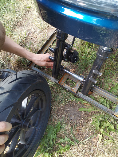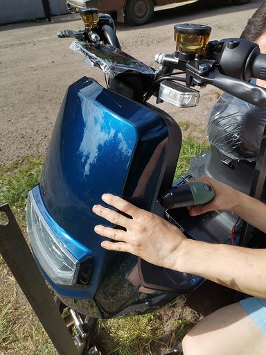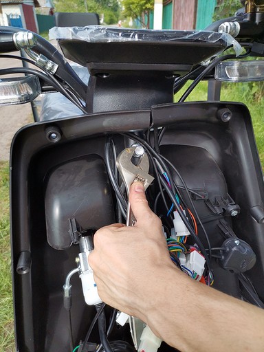 Здесь установлена не увесистая свинцово-кислотная батарея, а легкая (8 кг) литиевая напряжением 72 В ёмкостью 20 Ач. Она позволяет без подзарядки проехать до 60 км при скорости в 30 — 40 км/ч. Мы проверили: если не злоупотреблять скоростью, вдвоем можно уехать на это расстояние. Заодно протестировали режим его «аварийной доставки»: батареи не хватило на пару километров, и пришлось толкать скутер вручную. Ничего, справлись.