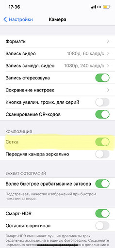 Чтобы включить сетку, откройте «Настройки», пролистайте вниз и выберите «Камера». В появившемся меню активируйте переключатель напротив пункта «Сетка».