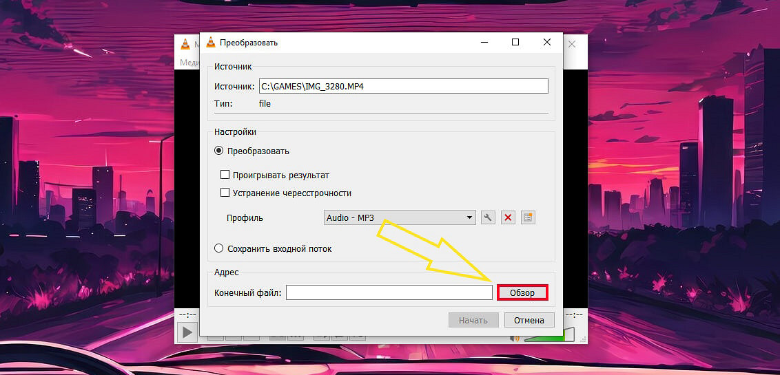 - В строке «Конечный файл» нажимаем «Обзор» и ставим в конце MP3 вместо другого расширения (текст после точки). Также выбираем папку, куда отправится готовый файл.