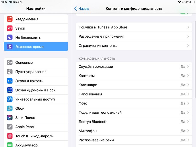 В разделе «Контент и конфиденциальность» вы также можете задать параметры безопасности своего устройства. Например, запретить покупки и установку приложений в App Store, ограничить возрастную категорию контента и даже выключить рекламу от Apple. Здесь же есть настройки, которые позволят ограничить доступ к службам геолокации, микрофону или контактам.