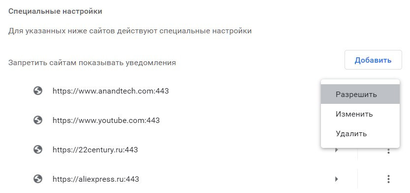 - Здесь можно полностью разрешить или запретить отправку уведомлений сайтами и создать черный или белый список исключений. К примеру, вы можете разрешить уведомления для всех сайтов, кроме некоторых. Хотя куда эффективнее поставить запрет на уведомления и разрешать их только нужным вам сайтам вроде Gmail, Facebook и т.д.
